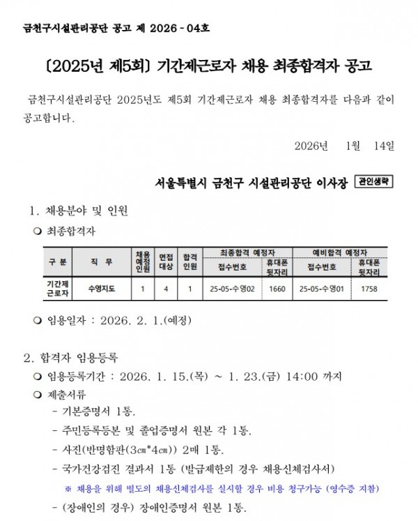 | 제목 | [2025년 제5회] 기간제근로자 채용 최종합격자 공고 | ||