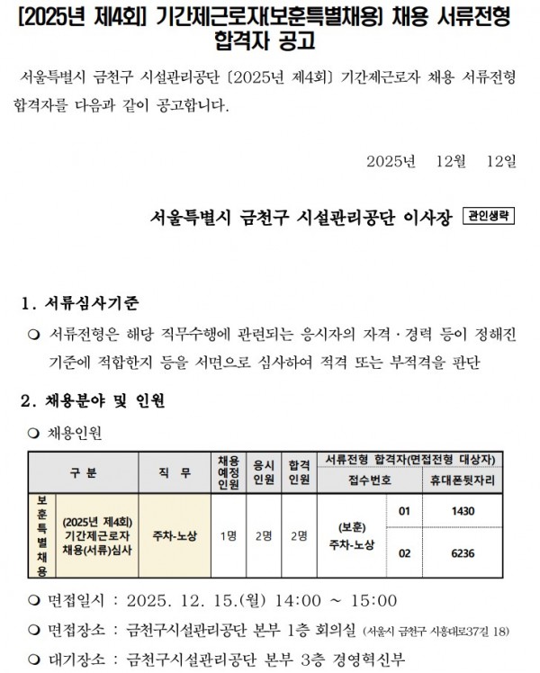 | 제목 | [2025년제4회]기간제근로자(보훈특별채용) 서류전형 합격자 공고 | ||