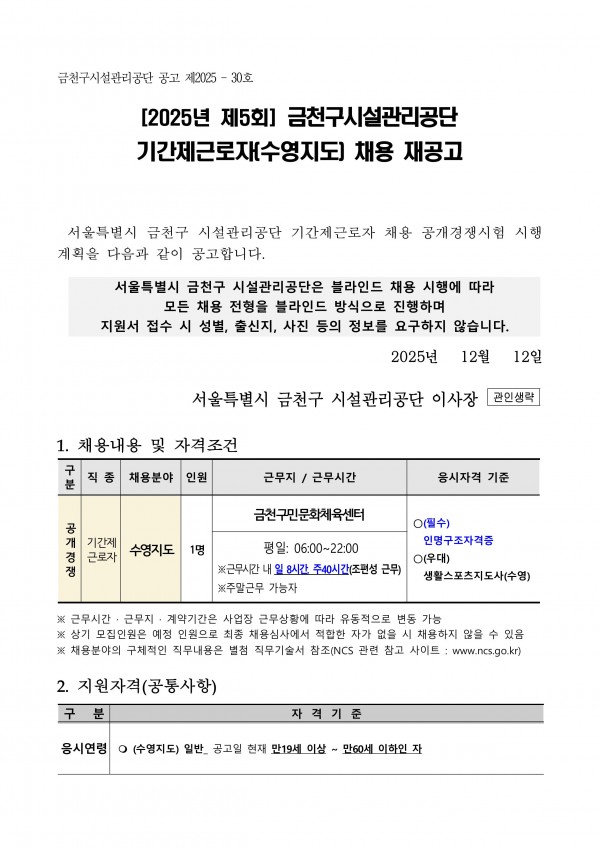 | 제목 | [2025년 제5회] 기간제 근로자(수영지도) 채용 재공고 | ||