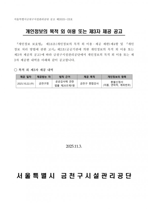 개인정보의 목적 외 이용 또는 제3자 제공 공고